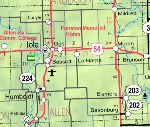 Allen County is located in southeastern Kansas, two counties west of the Missouri state line and three counties north of the Oklahoma state line. It is twenty-one miles from north to south and twenty-four miles from east to west, covering about 505 square miles. The county seat is Iola.