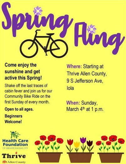 Don’t have a bike, but would like to participate? Not a problem. We meet in front of Thrive and you can check out a free Bike Share bike before the ride. For further information call Thrive at 620-365-8128. Keep up to date with our rides by following our Facebook page.