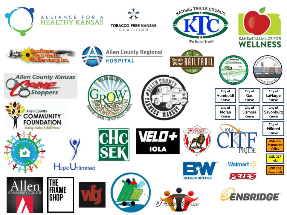 A volunteer-built and volunteer-maintained 6.5-mile rail-trail linking Iola and Humboldt. - The cooperation and support of local governments is critical to improving health, livability, and economic vitality. We are proud to work with Allen County and the cities of Elsmore, Gas, Humboldt, Iola, LaHarpe, Mildred, Moran, and Savonburg.